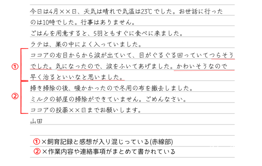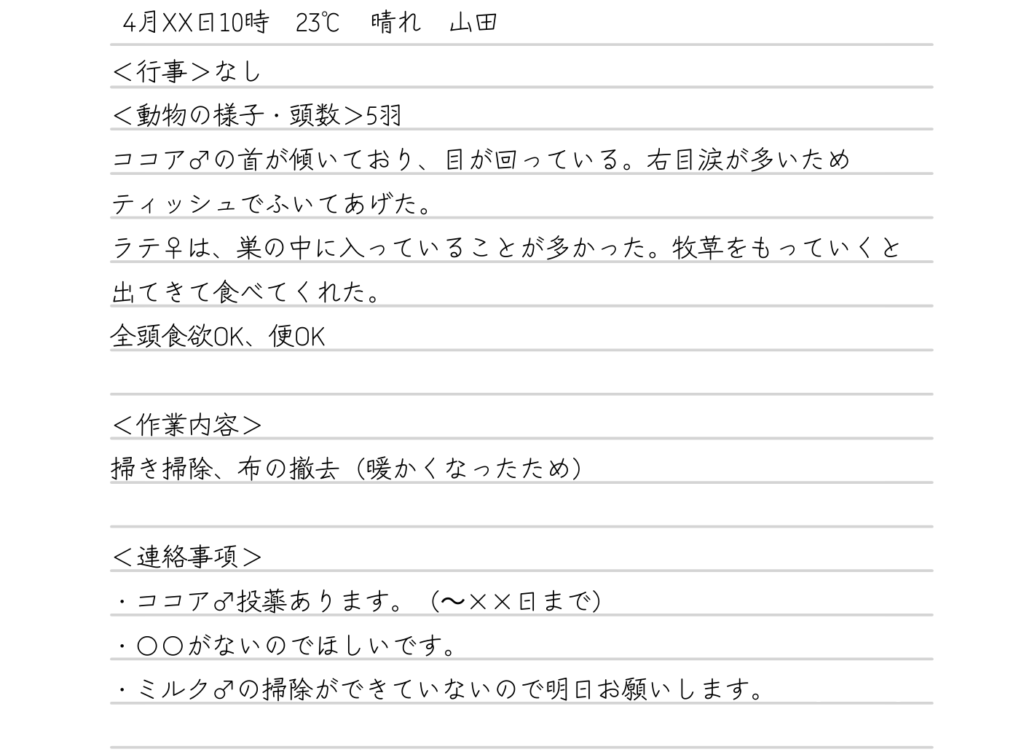 お掃除チェックだけでは、動物の健康状態をほかの担当者に伝えることができません。動物の様子や健康状態を担当者全員に把握してもらうために一言でもいいので、文章で書いたほうがよいでしょう。